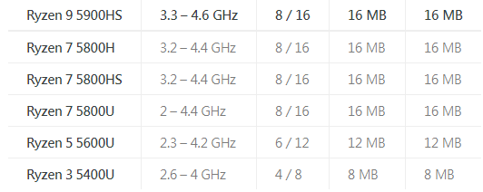 위 벤치에서 나온 5800U의 경우 Zen3아키텍쳐 기반 의 CPU로 8C 16T , 베이스 클럭 2.0 Ghz, 부스트 클럭 4.4 Ghz의 스펙을 가지고 있습니다.
