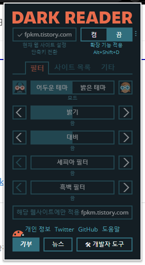 Dark READER 화면입니다. 이제 켜고 간단한 설정을 하면 끝납니다.
