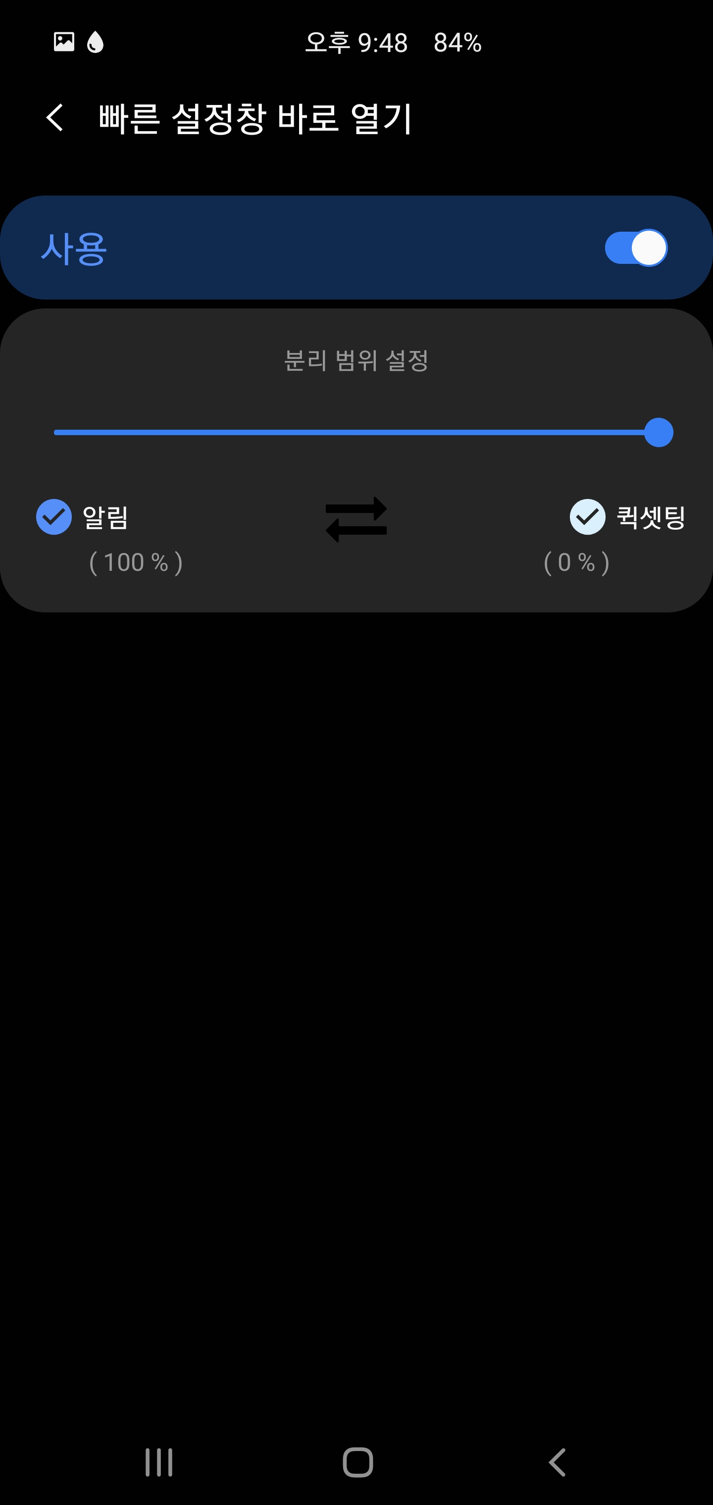 둘의 위치도 바꿀 수 있고 100%로 하면 좌우 스와이프 시 동일하게 알림 또는 큇셋팅이 나옵니다.