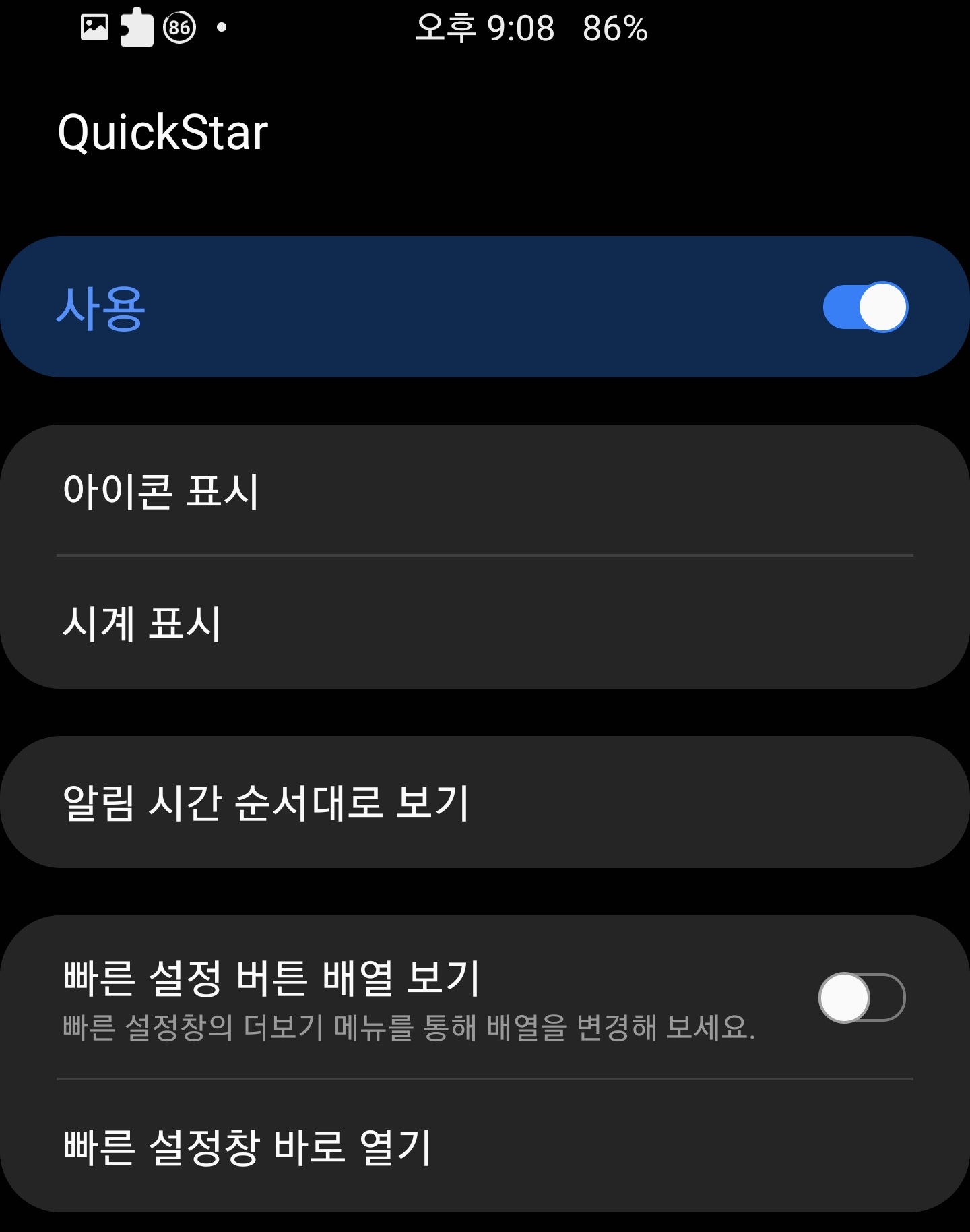 퀵스타의 경우 상단바와 퀵패널을 깔끔하게 정리할 수 있고 다른 어플은 몰라도 퀵스타만큼은 가장 호불호 따위 없을 정도로 반응이 좋은 어플 중 하나입니다.