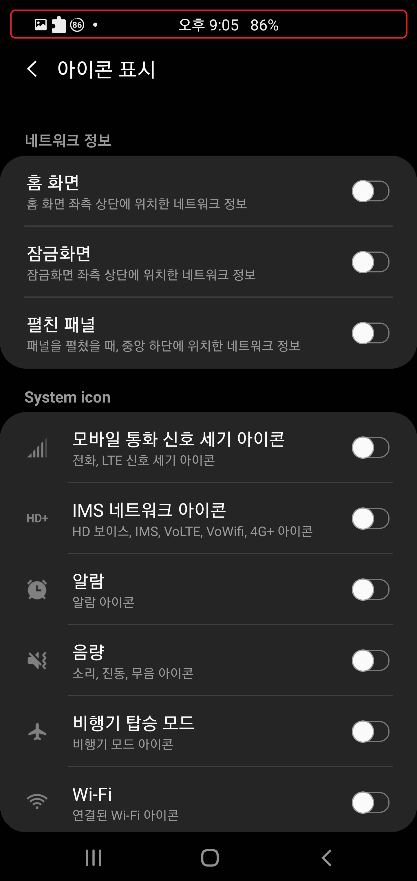 아이콘 표시는 현재 상단바에 보이는 1. 시스템 아이콘 2. 통신사 마크 을 끌 수 있는 기능으로