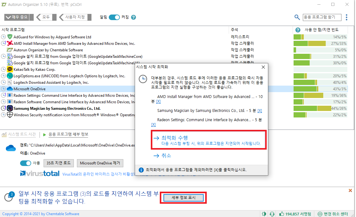 1.우선 하단의 [세부 정보 표시]를 눌러 최적화를 수행시켜줍니다. (바로 실행될 필요없는 프로그램을 30초늦게 실행시켜줍니다.)