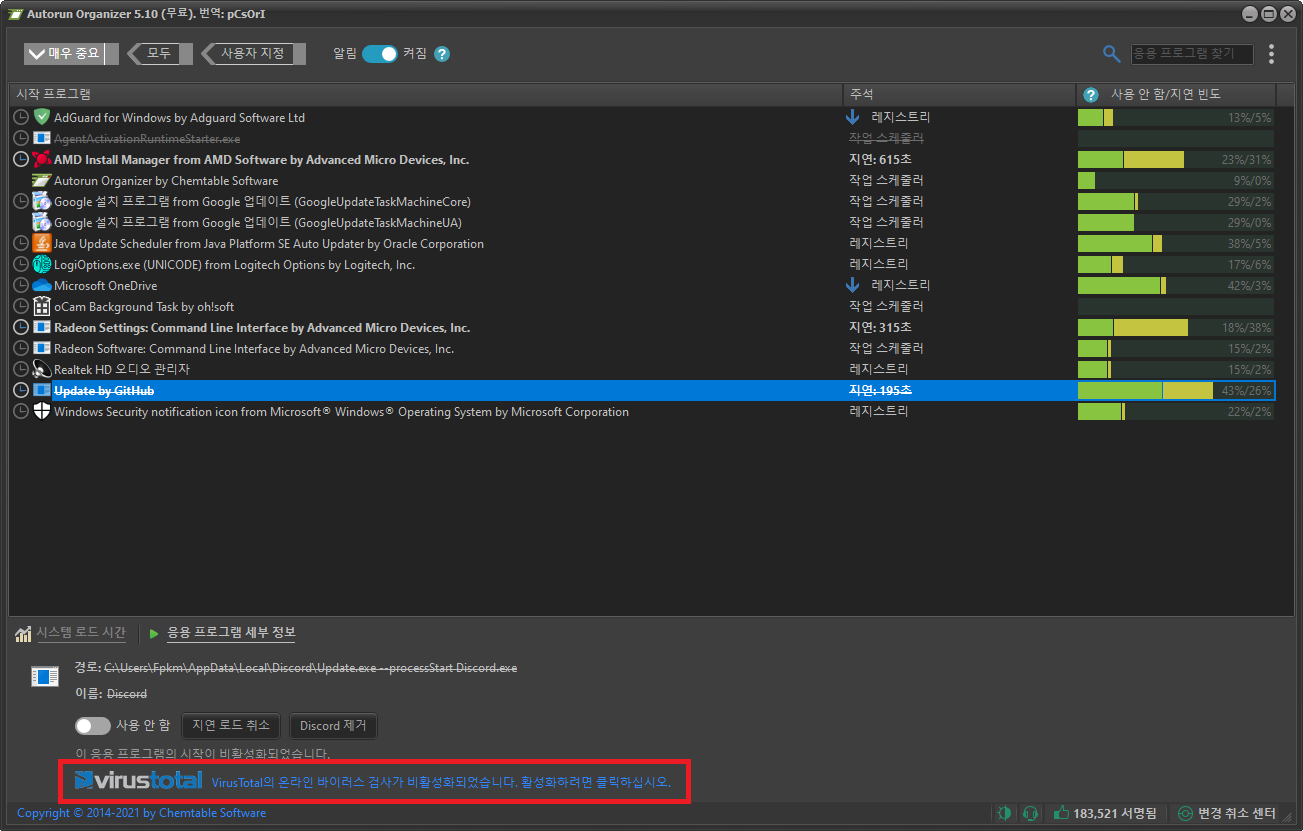 30초 지연 로드, Virustotal을 통한 바이러스 검사, 자동 실행 우선순위 관리등을 제공해 시작프로그램을 체계적으로 관리 하기 편리합니다.