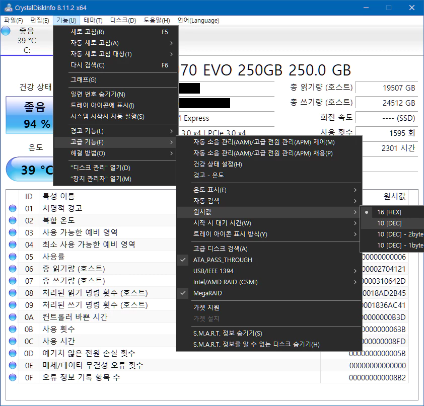 -데이터 무결성 오류 횟수 : 가장 중요한 요소이다. 0이 아니면 즉시 백업을 권장한다. 현재 사용에 문제가