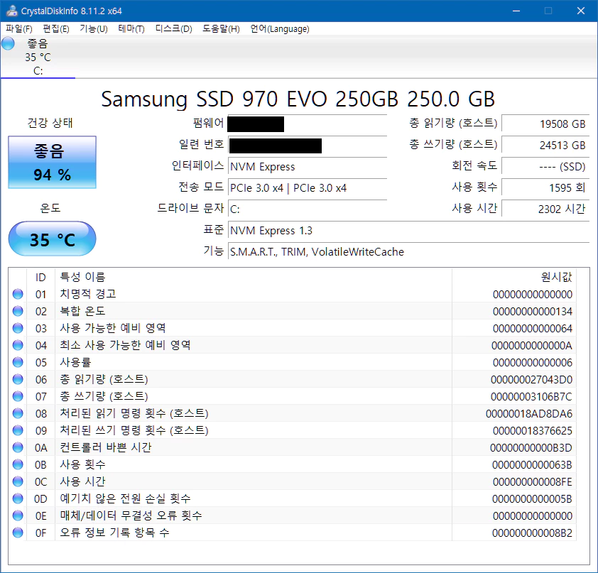 -[펌웨어] : 현재 SSD의 펌웨어 버전 (각 제조사 홈페이지에서 펌웨어 업데이트를 할 수 있다.)