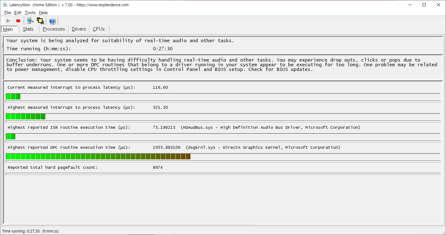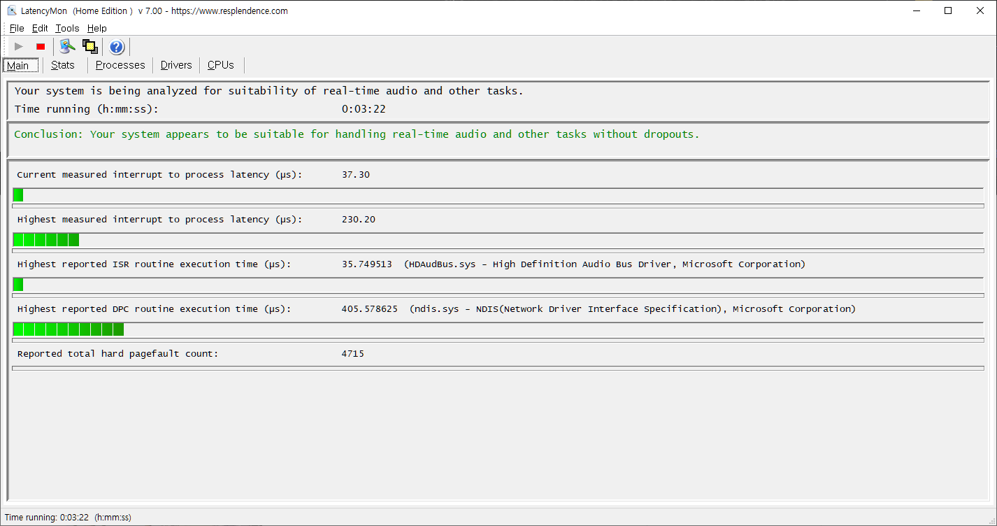 위 이미지 처럼 나올경우 문제가 거의 없는 상태로 볼수 있습니다. 대략 30분정도 실행시키면서 유튭강의 영상을 봤는데 LatencyMon의 경우에도 순간적으로 값이 튀는 경우가 있을수 있고 보고서 결론은 봐도 별 문제는 없는 상태입니다.