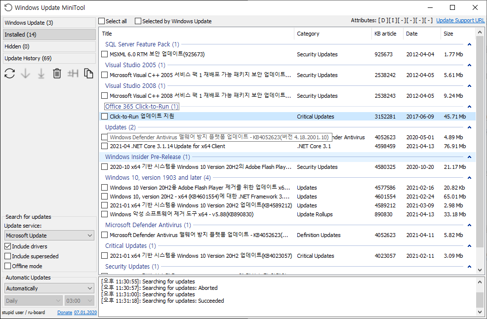 지금까지 업데이트한 내역입니다. 대부분 보안기반의 디펜더나 장치드라이버 업데이트가 주류