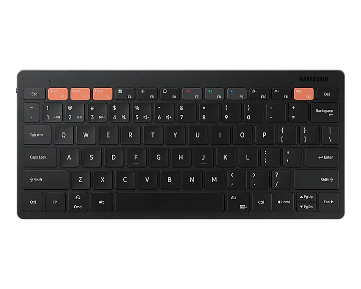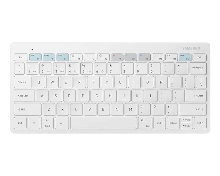 삼성에서 공개한 덱스(Dex) 호환 블루투스 키보드입니다. 3개의 장치에 동시 연결 가능한 블루투스 키보드로 F7/F8/F9 키를 이용해 빠른 장치 전환이 가능합니다.