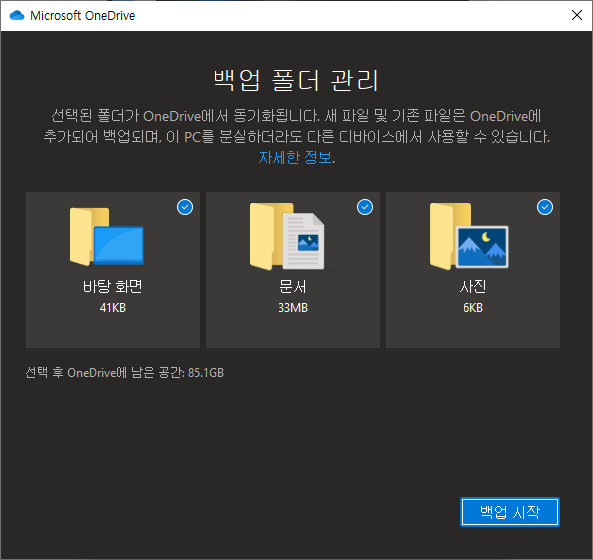 바탕화면, 문서, 다운로드가 동기화가 되고 있는지 혹시 되어있다면 해제해주시면됩니다.