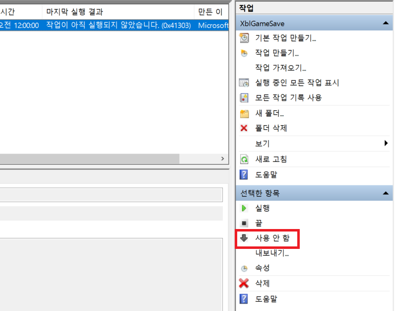 작업 스케줄러 라이브러리 - XblGameSave - XblGameSaveTask를 눌러 우측 하단에 '사용 중지'를 누르면 됩니다.