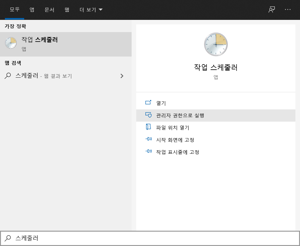 1. 윈도우키를 눌러 스케줄러를 '관리자 권한으로 실행' 해줍니다.