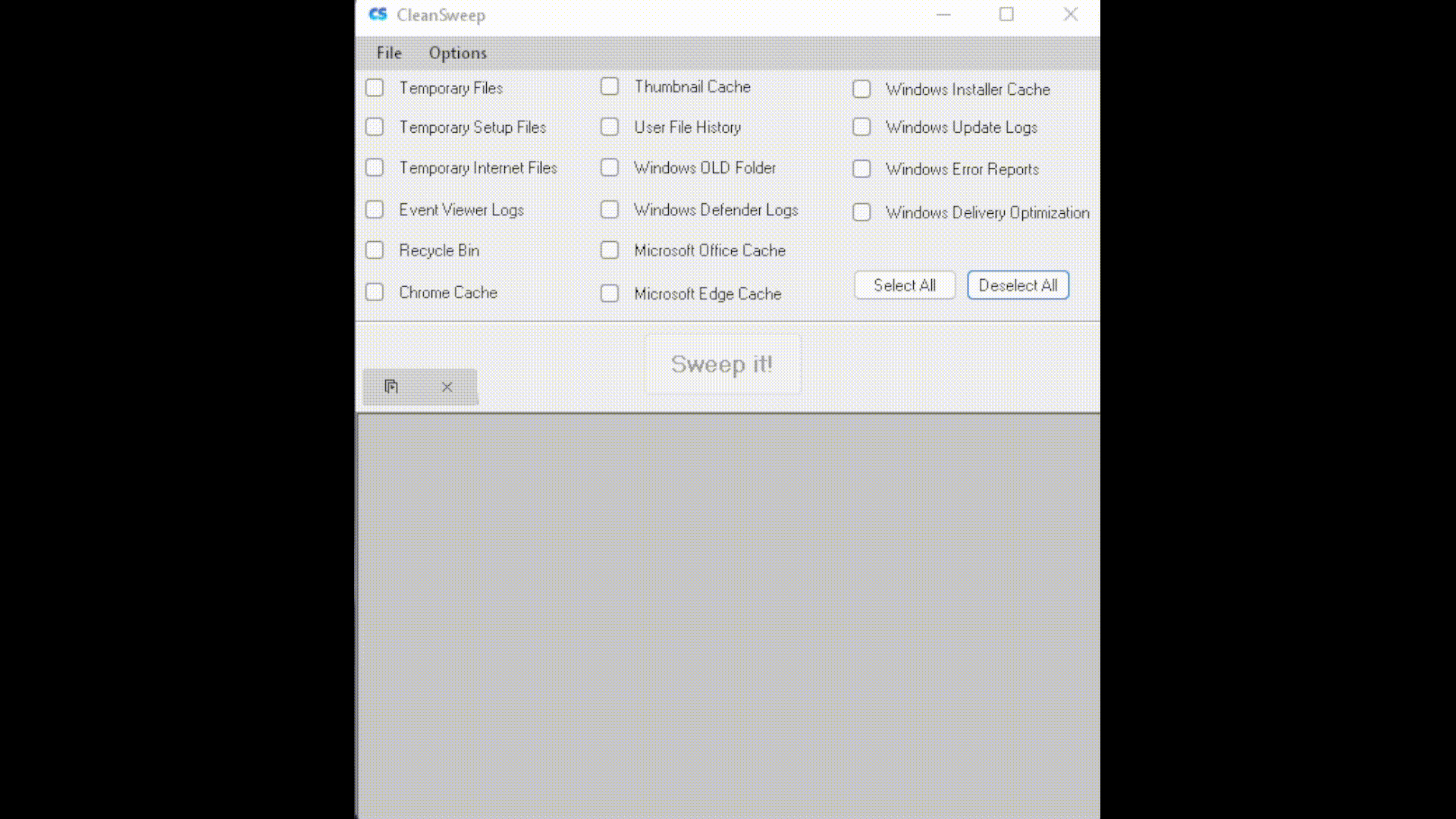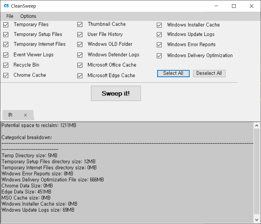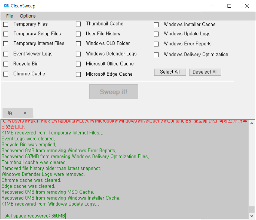 원하는 옵션을 선택하거나 모두 선택하여 Sweep it! 을 눌러주시면 됩니다.