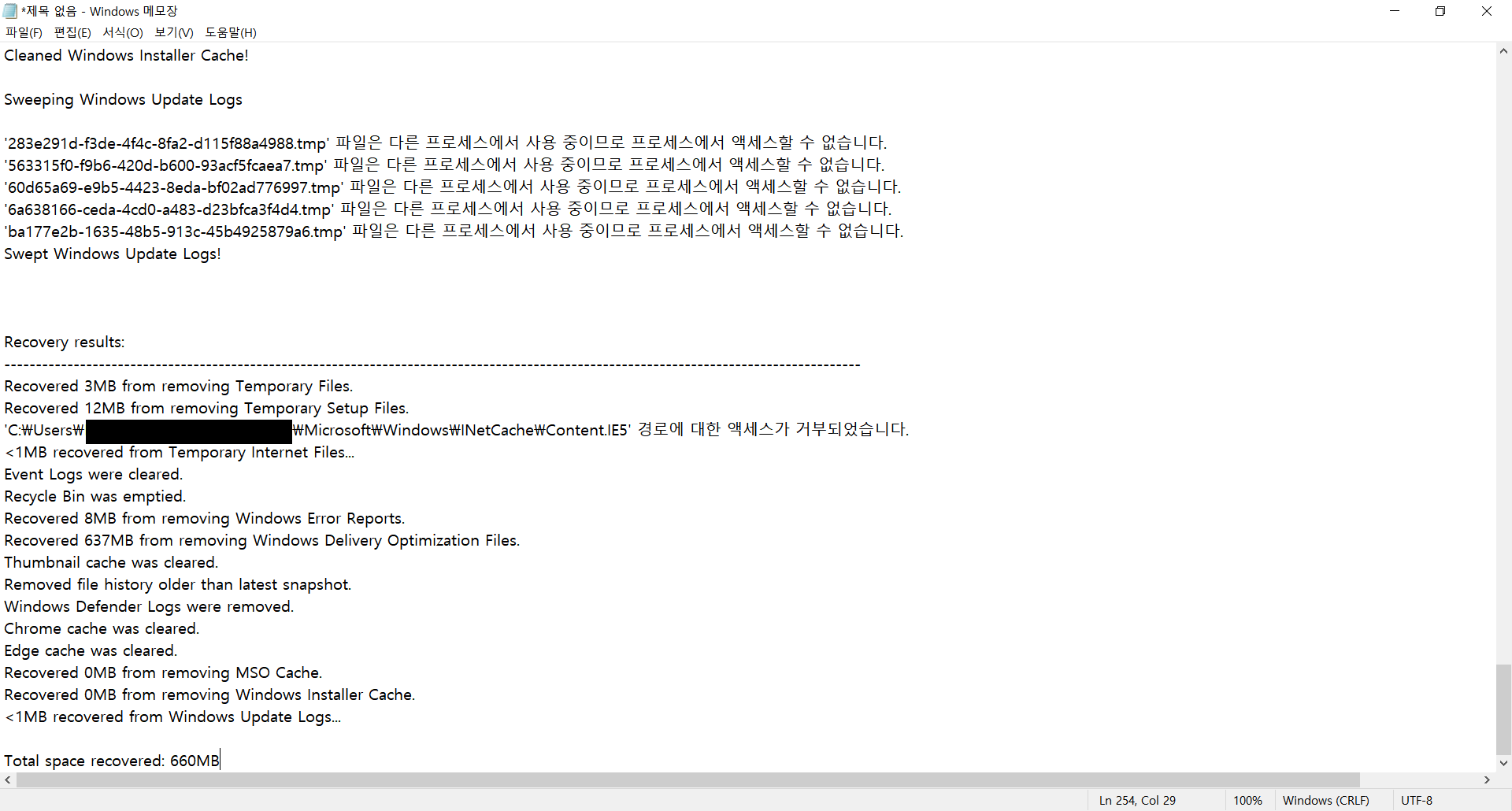 모두선택하여 정리해봤습니다. 제 기준에서는 총 660MB가 정리되었다고 합니다.