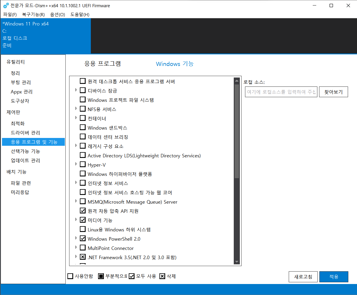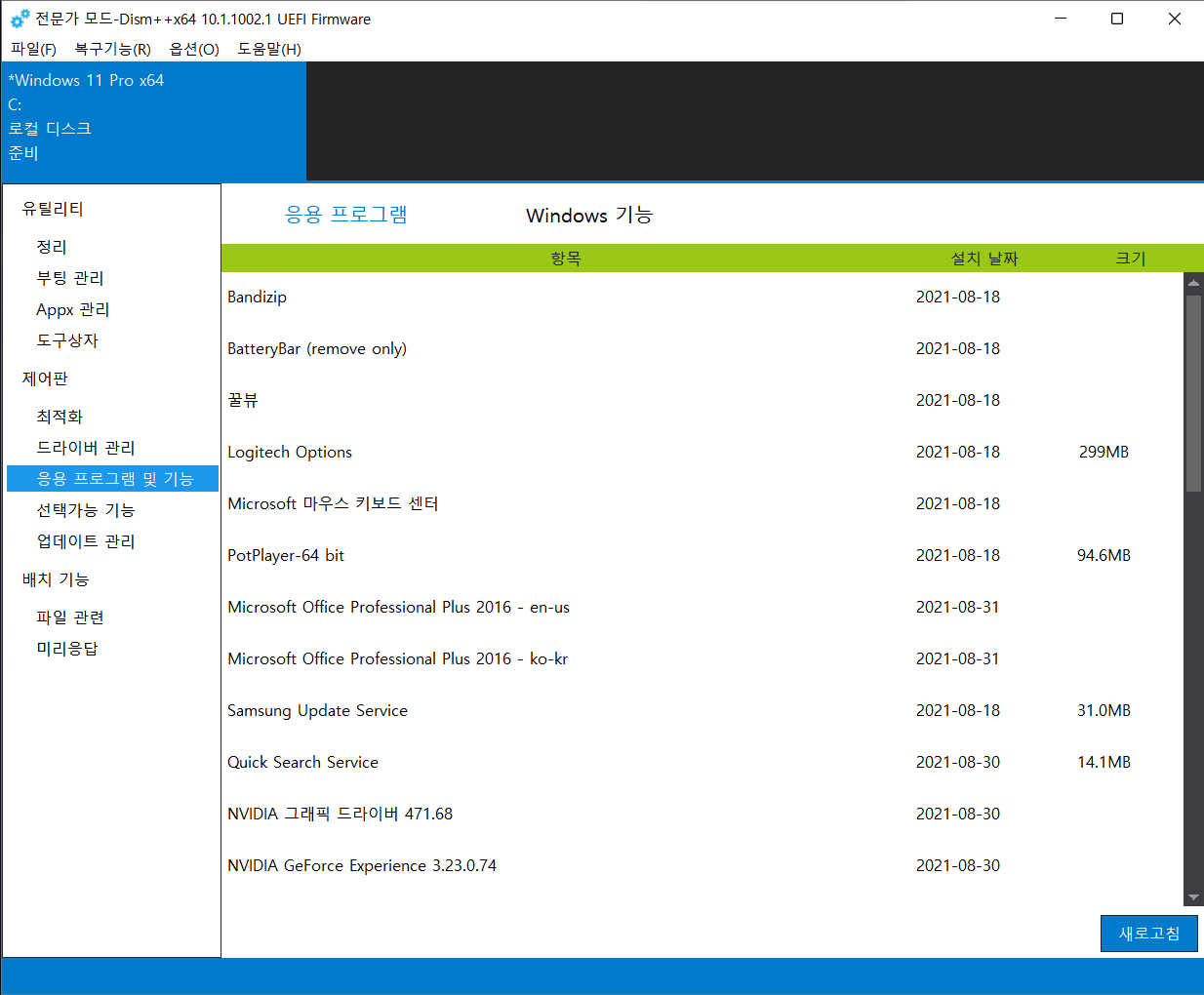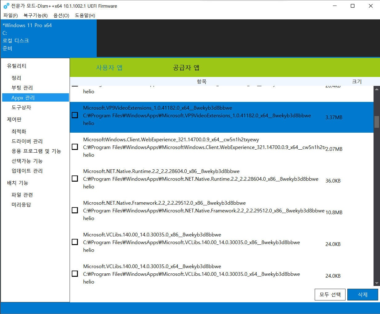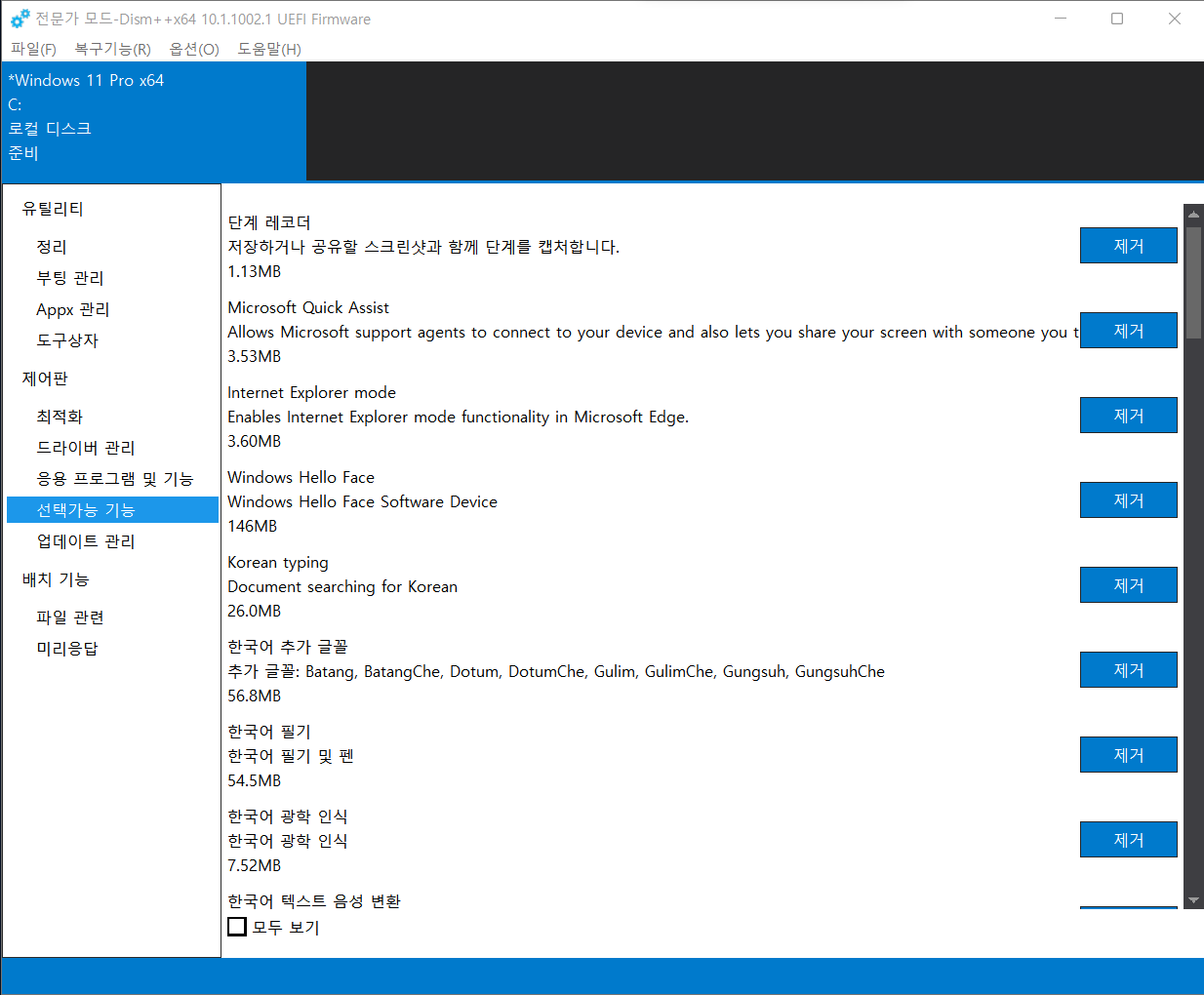 powershell로 삭제를 했던 윈도우 유니버셜 앱들을 여기선 쉽게 삭제할수있습니다.