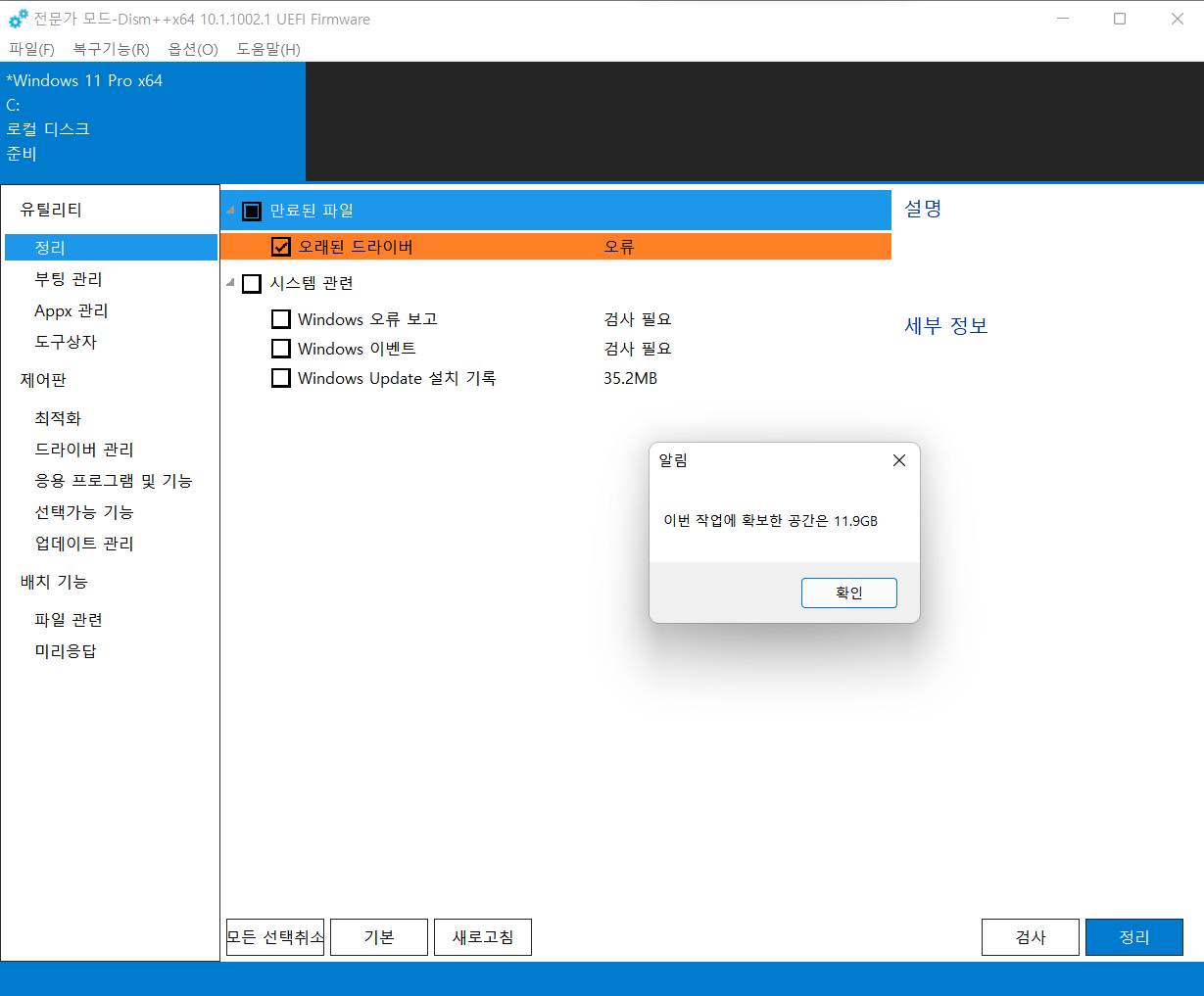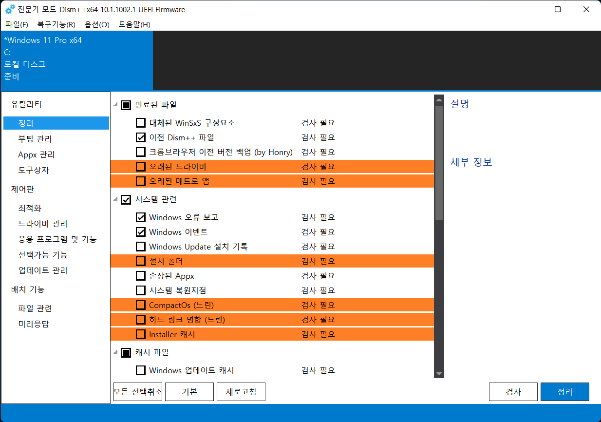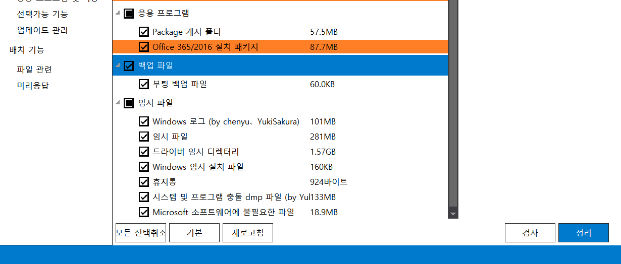 체크하면서 본인PC에 맞게 지우면 안될 요소만 제외하고 체크하고 검사 -> 정리하면됩니다.