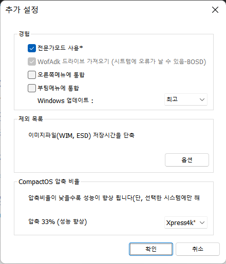 CompactOs <- 윈도우 파일 압축 , 개인선택 ,사용에 문제는 없고 쓰기속도만 소폭 하락, 용량확보