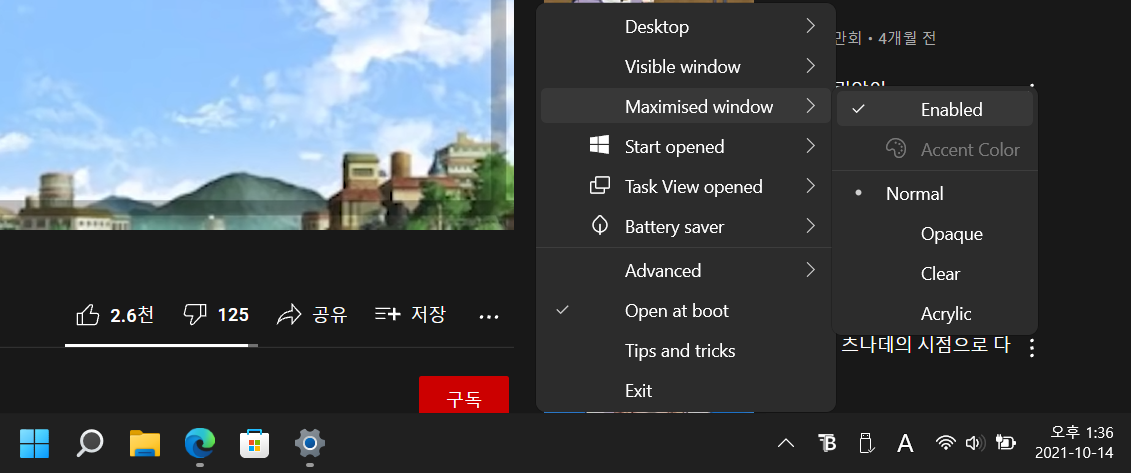 윈도우의 작업 표시줄을 투명하게 세팅해주는 프로그램입니다. (윈도우11 추천)