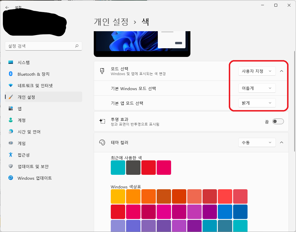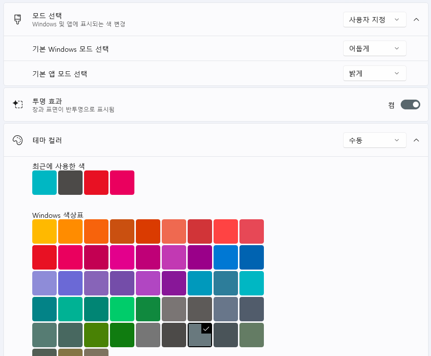 사용자 지정으로 모드는 어둡게 앱모드는 밝게 해주셔야합니다.