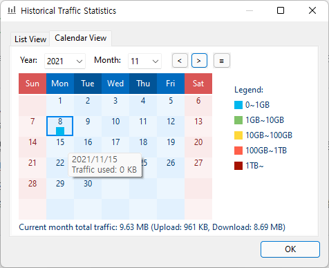 트래픽 사용기록을 날짜별로 혹은 리스트 형식으로 볼수있음