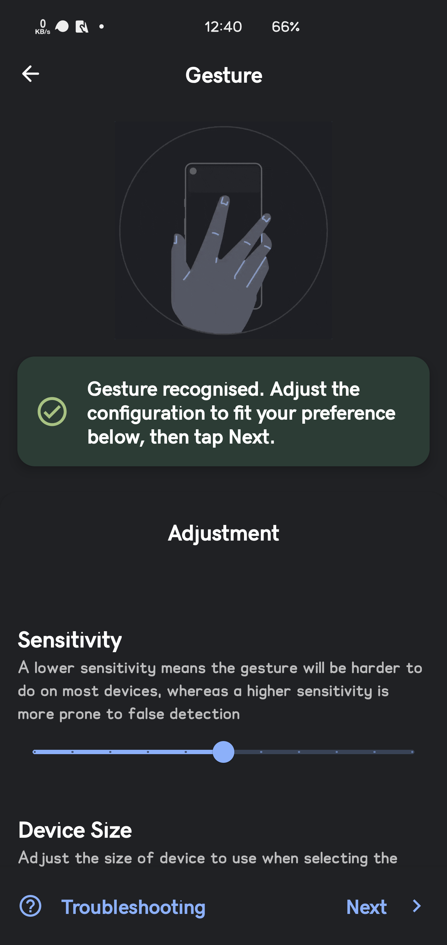 제스처 메뉴가 아까 만지던 민감도와 기기 크기설정이다.
