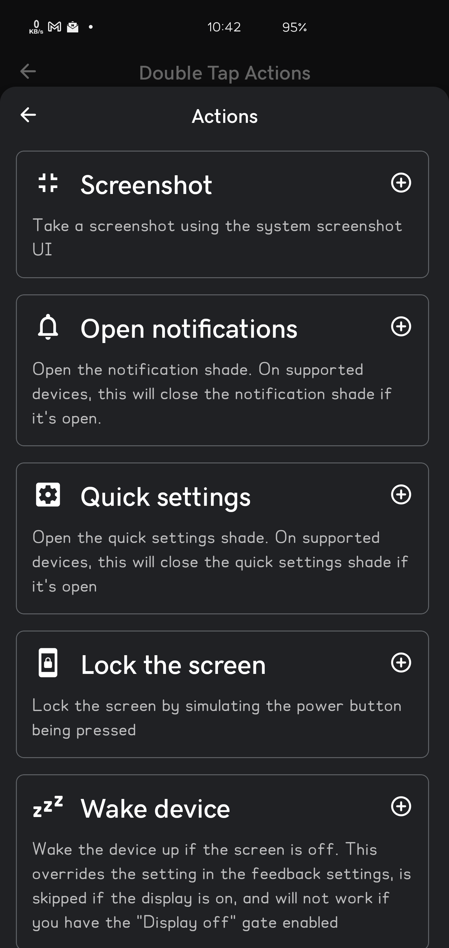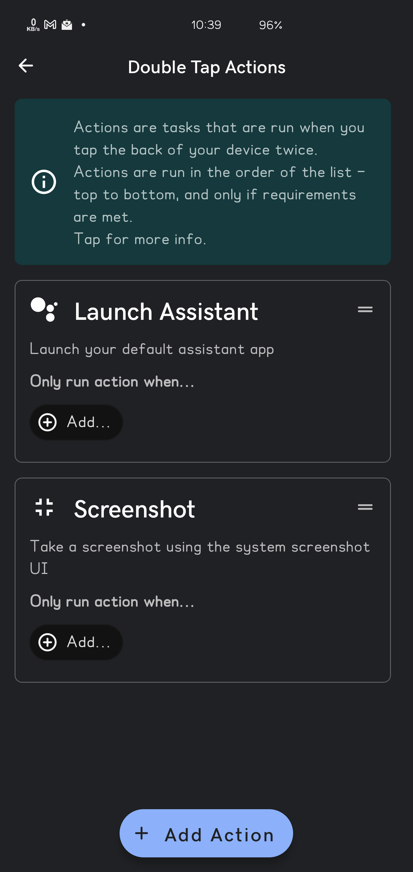 더블탭 액션메뉴 : 후면 더블 탭 했을때 실행할 동작과 조건을 설정할수 있다.