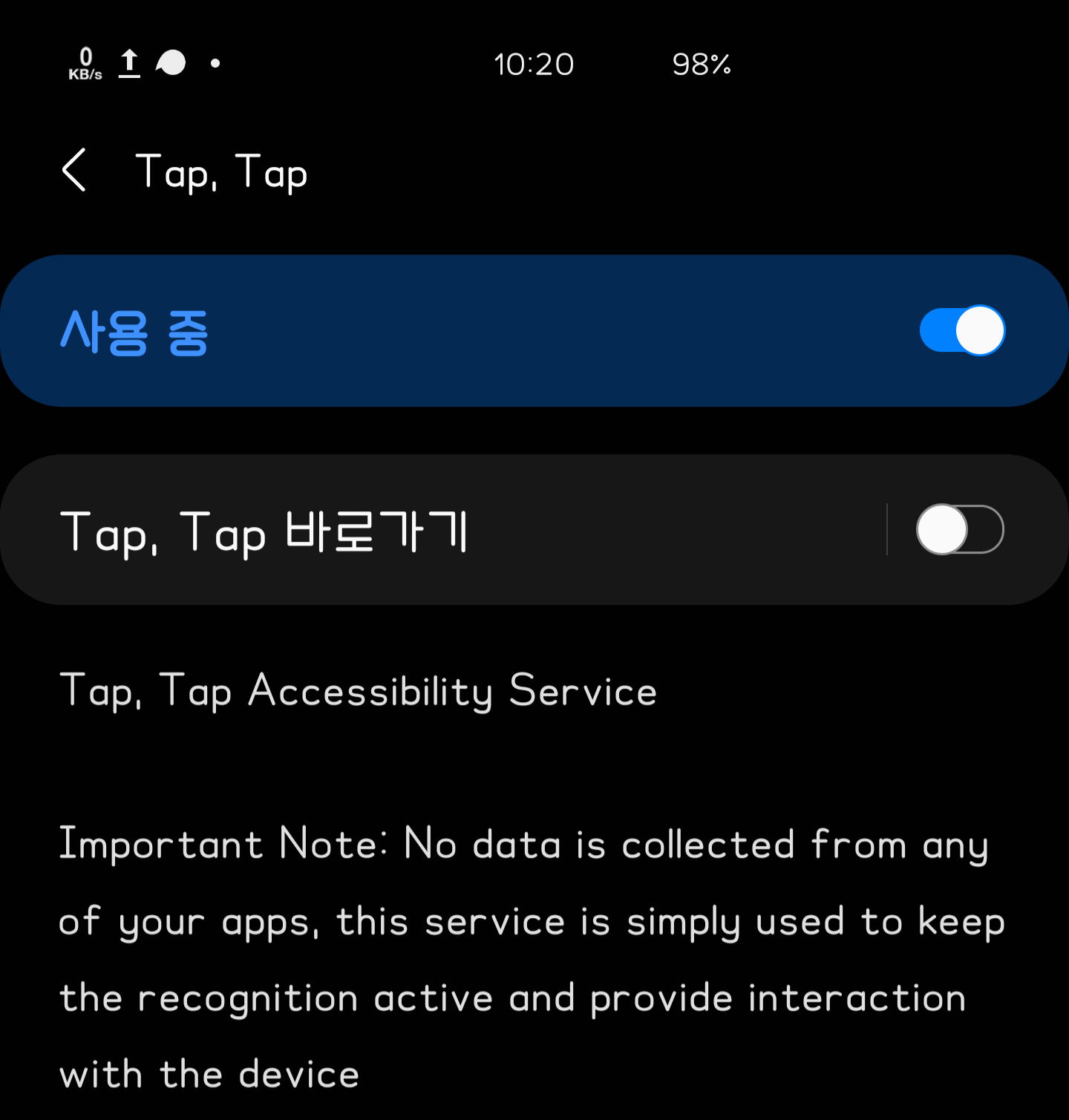 설정 - 접근성 - 설치된 서비스 - [Tap, Tap 사용중] 으로 변경