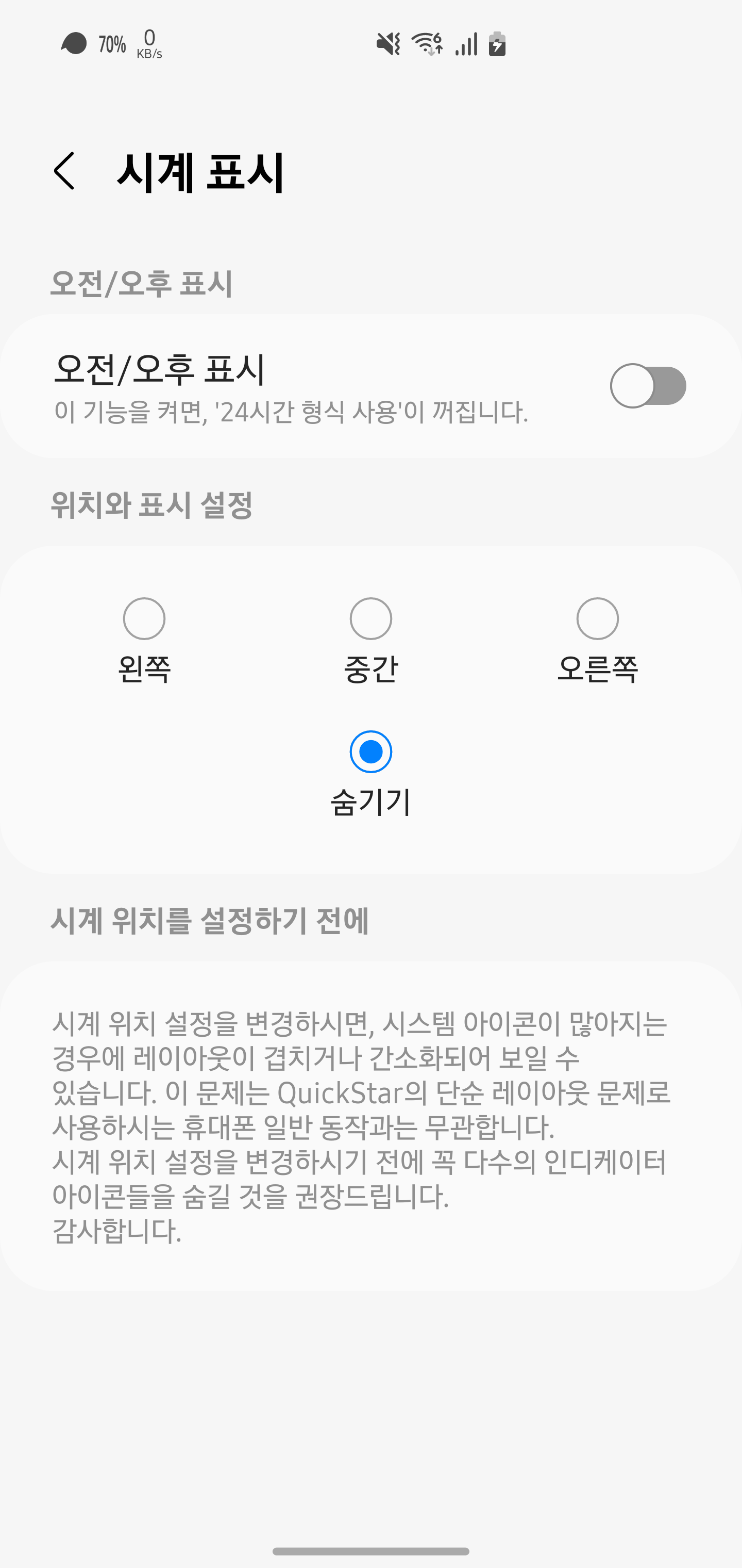 오전/오후 표시와 위치(숨기기)를 조정할수있습니다.