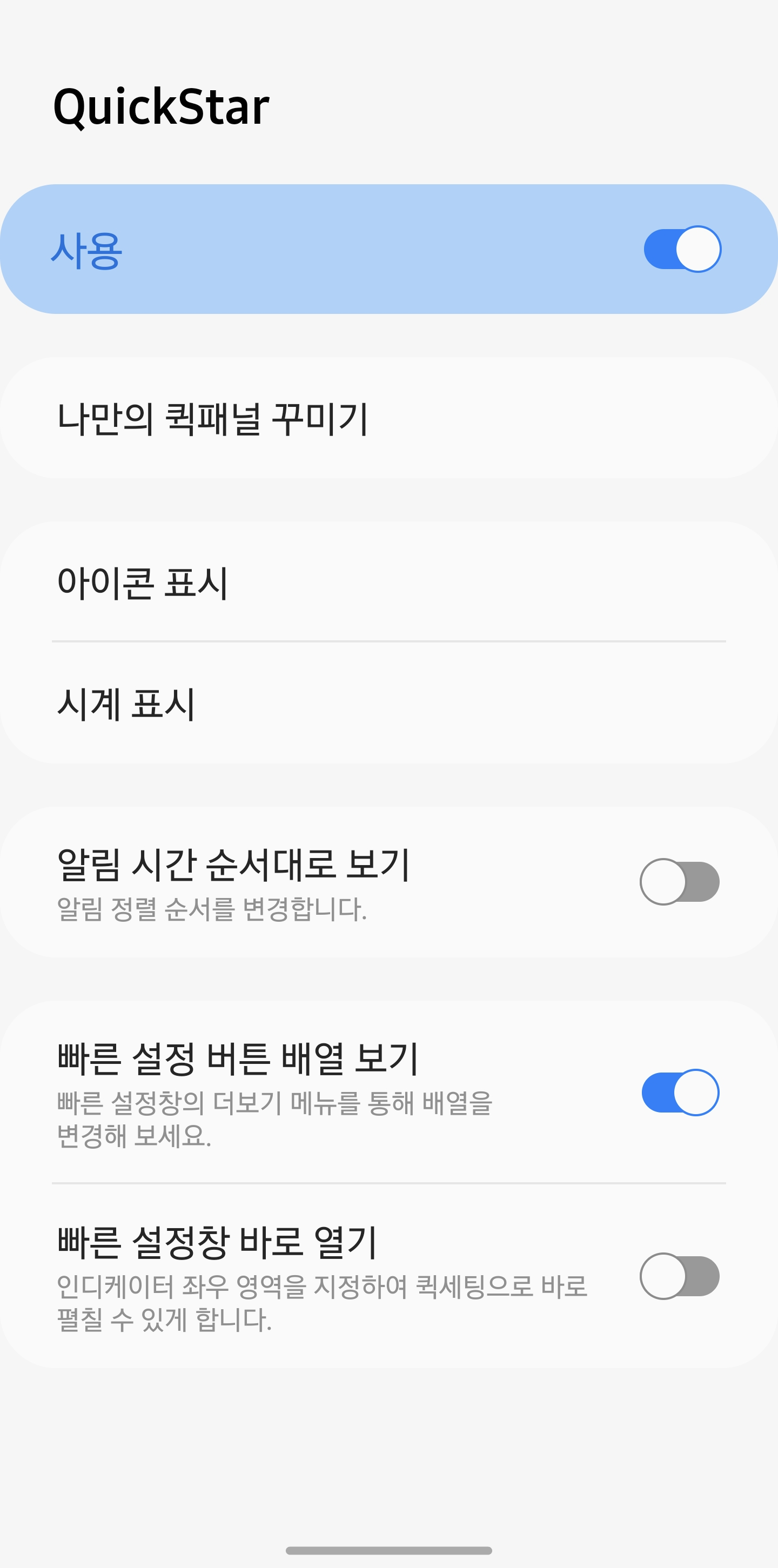 심플하고 개성있는 퀵패널 알림창을 구성할 수 있습니다. [설명] - 복잡한 상단바를 간단하게 줄여 보세요. [One UI 3 Only] - 아래 기능 추가 됩니다. 1) '알림 시간 순서대로 보기' 2) '빠른 설정 버튼