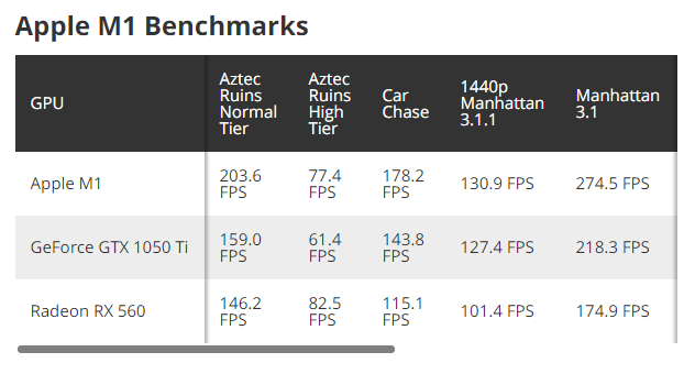 애플 실리콘 m1칩이 gpu도 라데온 뿐만아니라 1050ti까지 잡아버렸습니다..