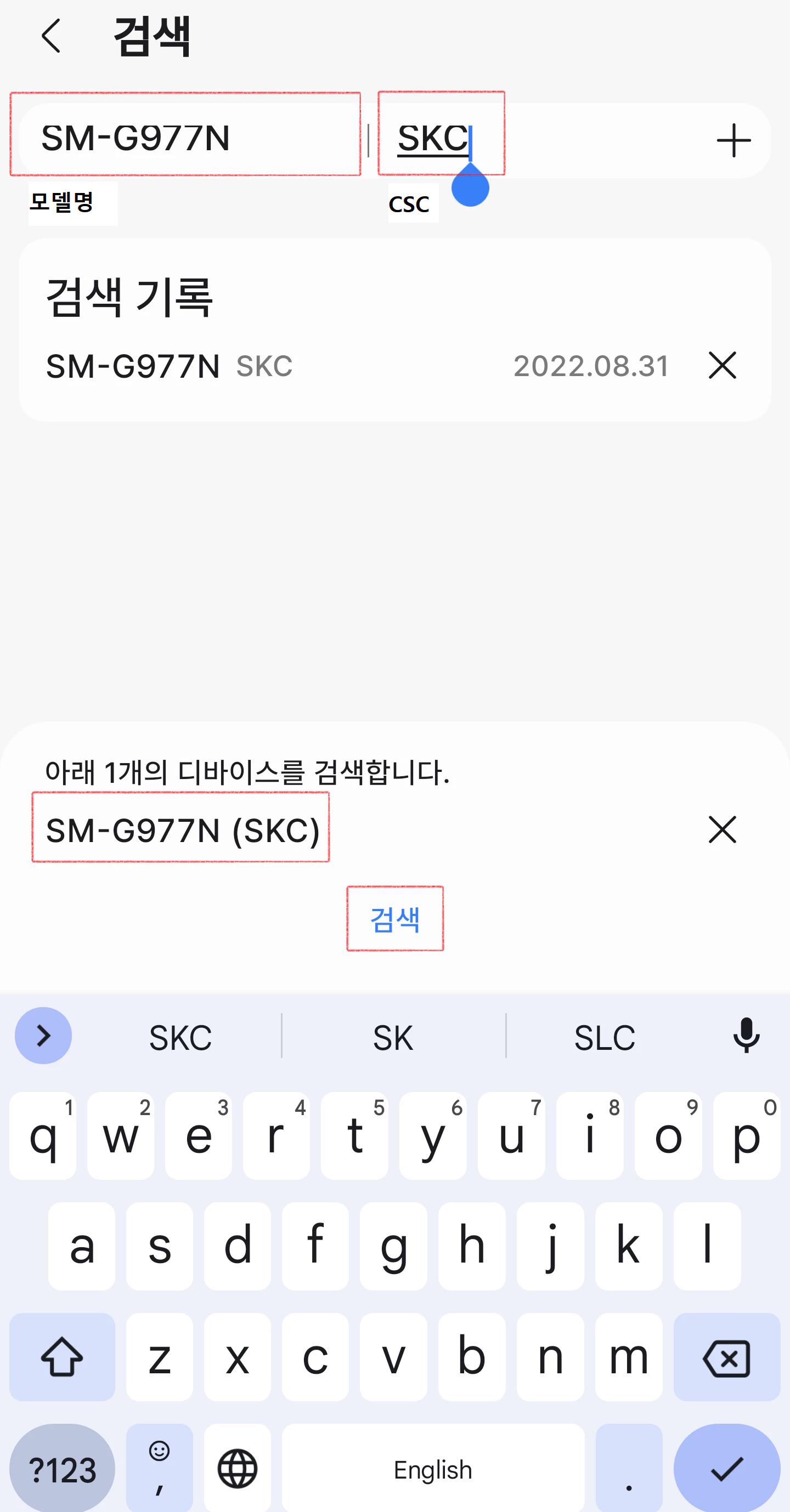 어플 홈 화면으로 돌아와 돋보기 모양의 검색창을 눌러 모델명과 CSC번호를 입력하고 검색을 눌러줍니다.