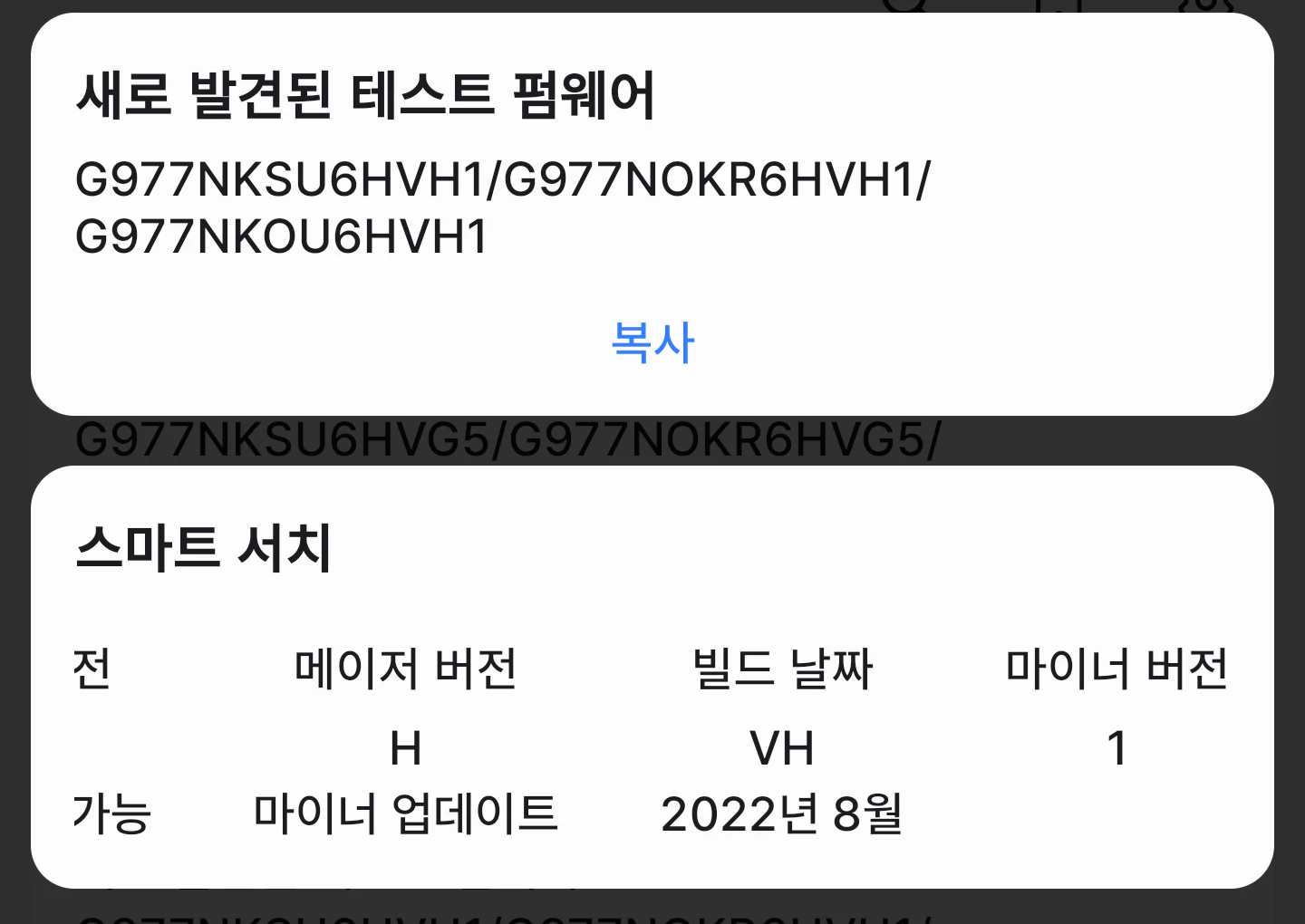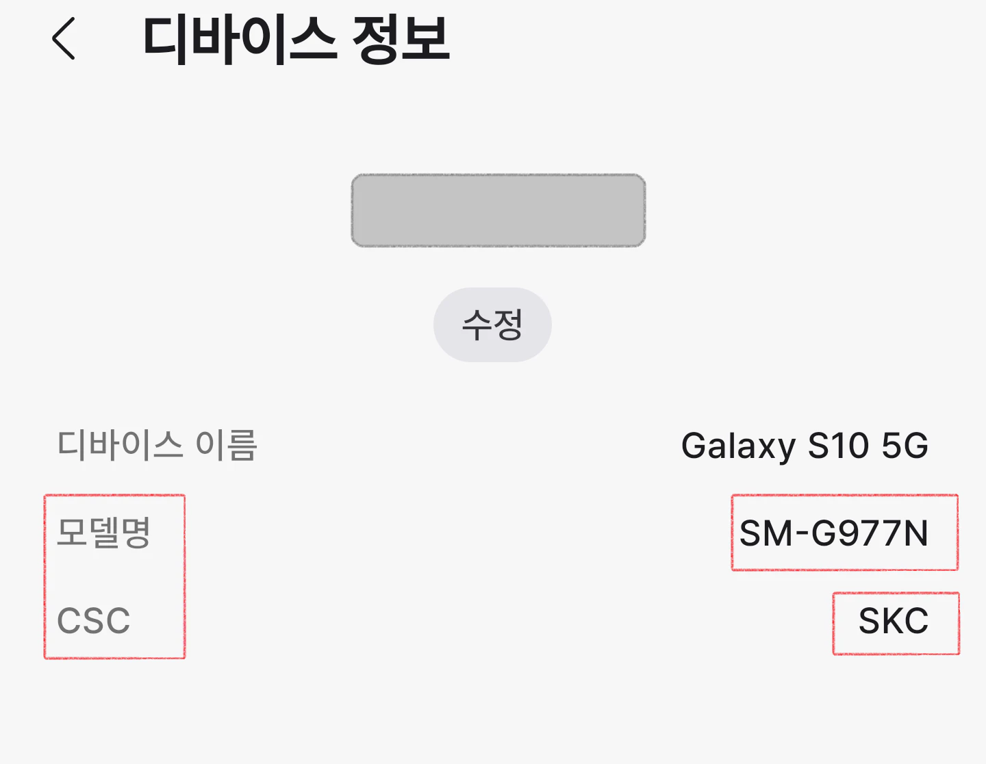 제 기기인 S10 5G의 경우 모델명은 SM-G977N, CSC는 SKC(SK텔레콤)로 조회되네요.