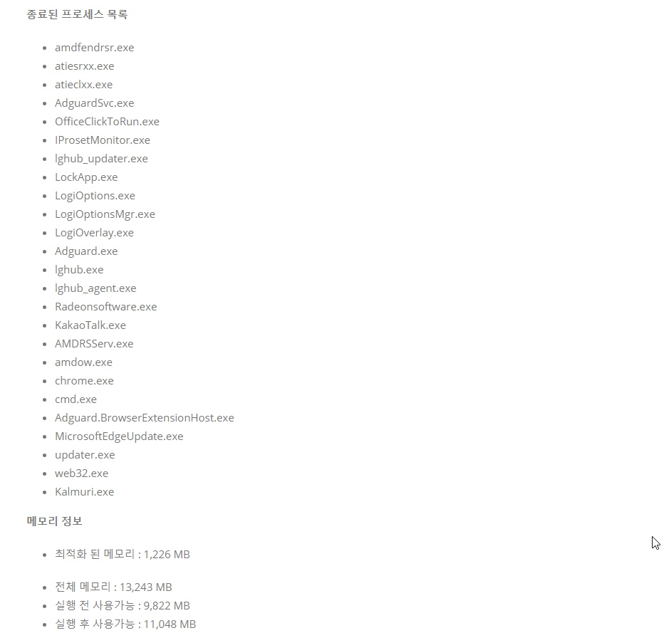 처음화면에서 초기화를 하면 필수드라이버(그래픽,오디오)를 제외한 모든 프로세스가 종료됩니다.