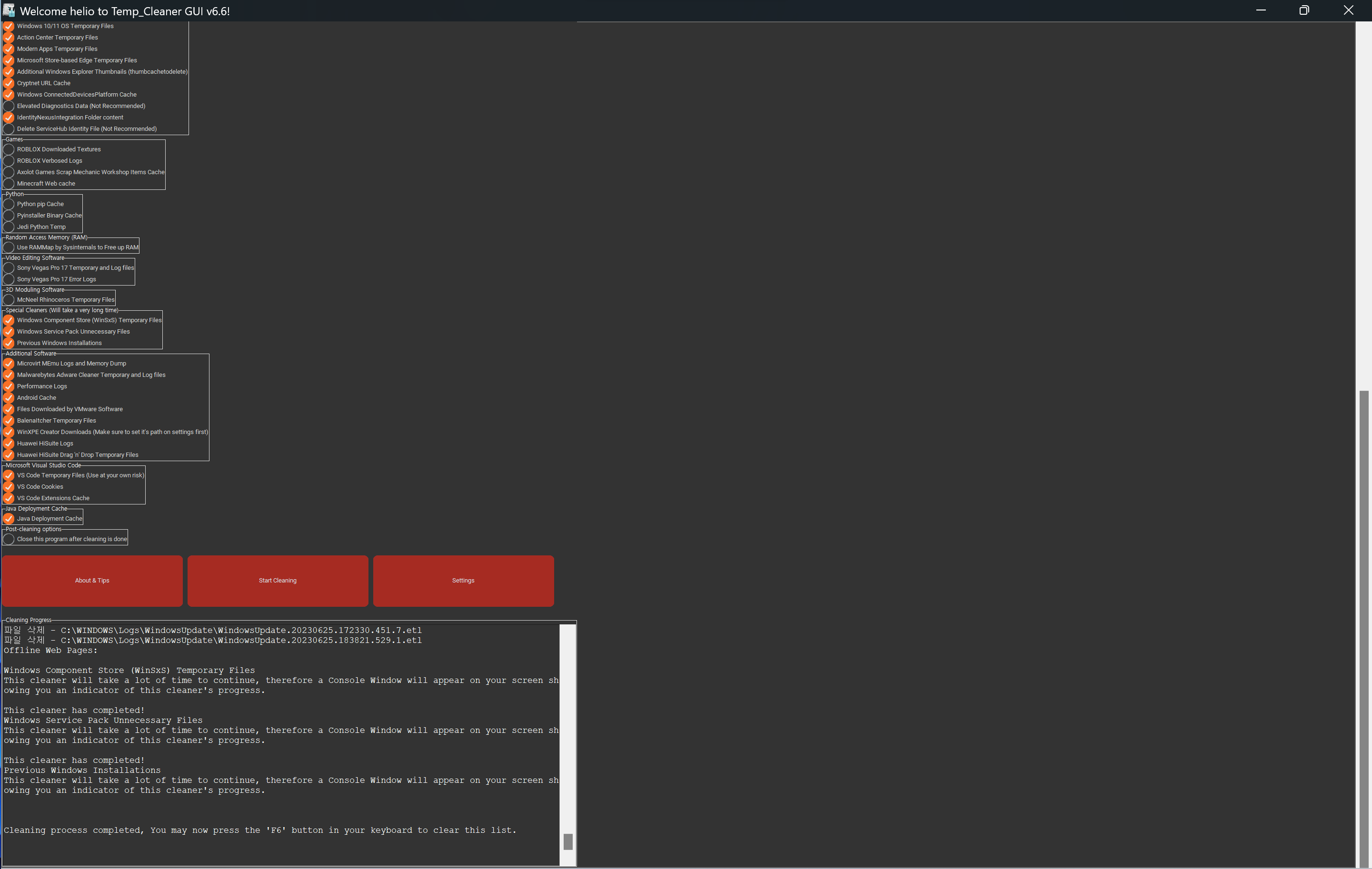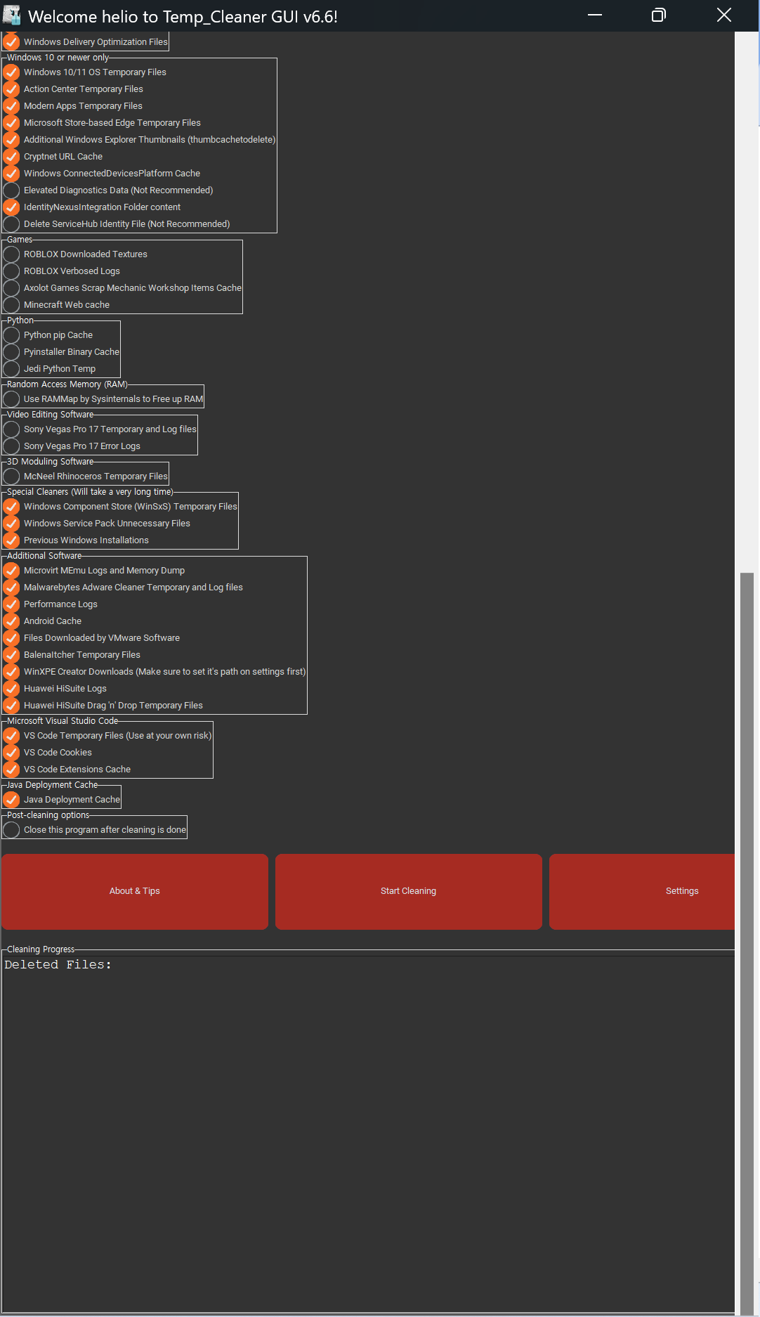 예를 들어 Temp_Cleaner GUI는 많은 소프트웨어 애플리케이션(맬웨어 바이트, Sony Vegas, VMWare, Roblox, Minecraft, Huawei 등)에서 임시 파일 삭제를 지원합니다. 그럼에도 불구하고, 타사 응용 프로그램이 복잡성과 체크할 상자 수를 증가시키는 것을 볼 수 있는 옵션은 없습니다.