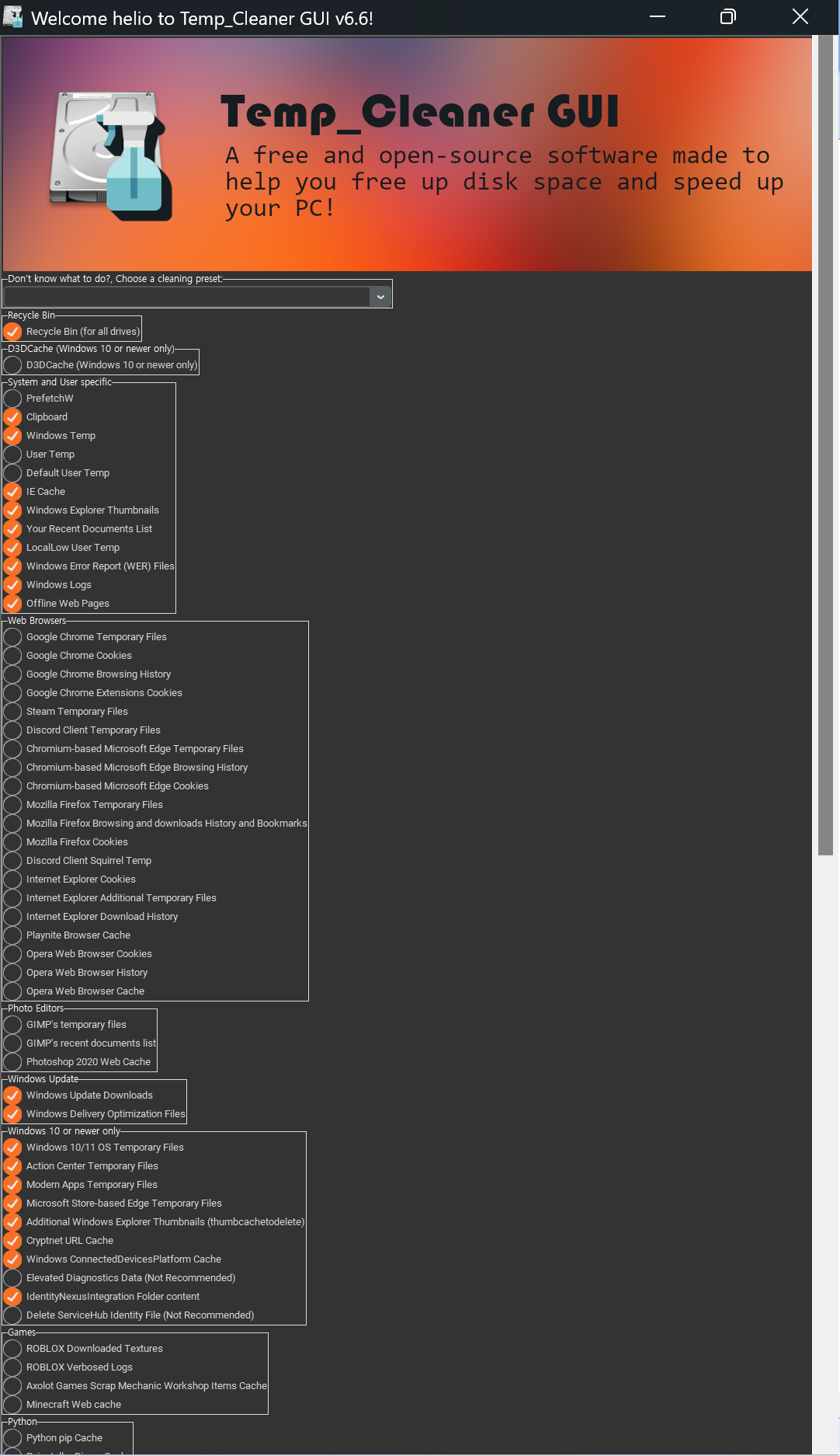 Temp Cleaner GUI는 디스크 공간을 확보하고 컴퓨터 속도를 향상시키는 무료 오픈 소스 프로그램입니다.