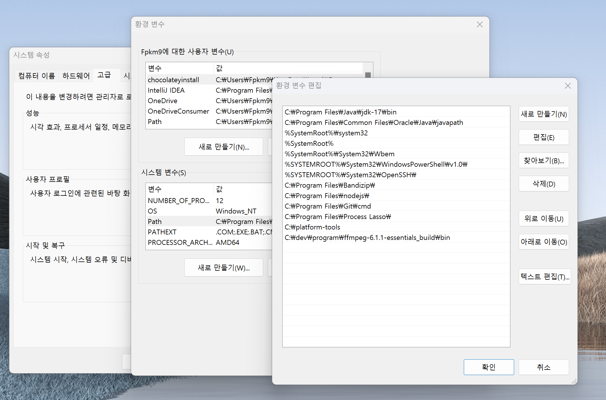 고급 시스템 설정 보기 -> 환경변수 -> 시스템변수(S)에 path 편집으로 들어가서 bin 폴더 경로를 붙여 넣어주면된다.