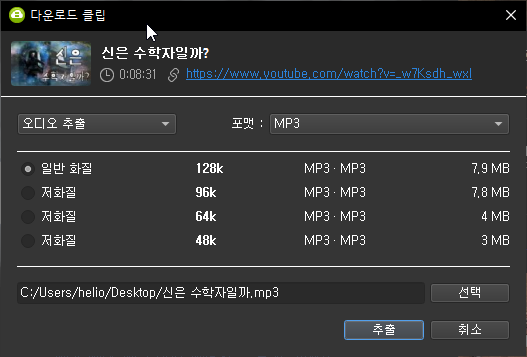 1. 동영상 다운로드 / 2.오디오 추출로 나눌수 있다.