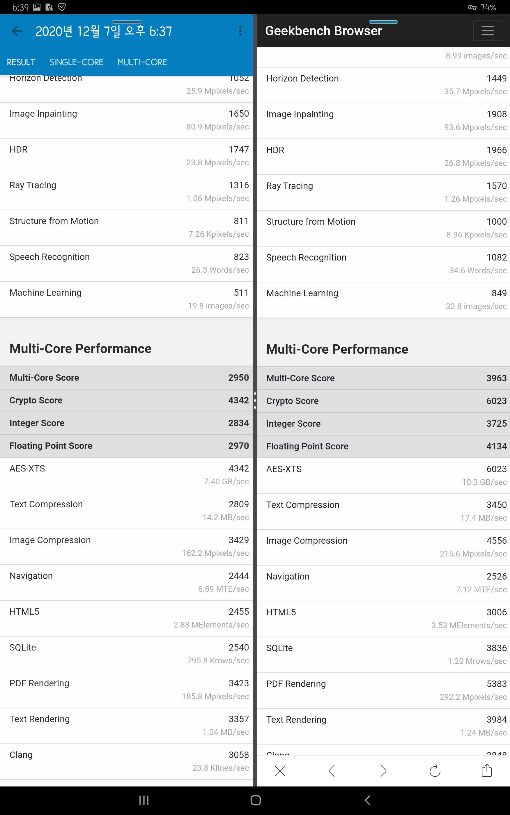 집에 있는 갤럭시 s7+ (sd 865+) 모델과 긱벤치5 비교 해봤습니다.