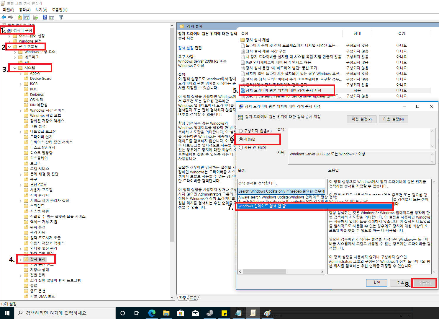 3.하드웨어 - 장치 설치 설정(S) - 아니요 - 변경내용 저장 - 적용