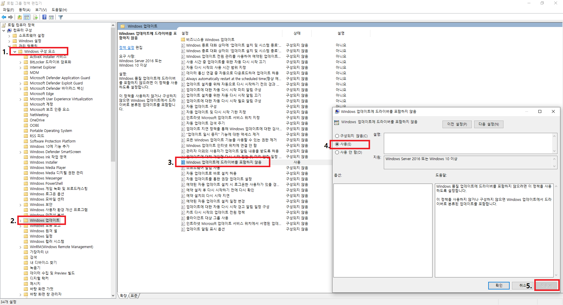 1. Windows 구성요소 → Windows 업데이트 →"Windows업데이트에드라이버를포함하지않음"→사용